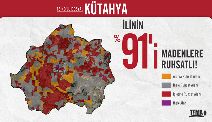 TEMA Vakfı’nın çalışmalarına göre 24 il yaklaşık 20 bin maden ruhsatına bölünmüş durumda. Ruhsatların büyük bölümünü ihale edilmeyi bekleyen ruhsatlar (14.967) oluştururken, ihale ruhsatlarını 2.158 ruhsat ile işletme ruhsatları; 1.871 ruhsat ile arama safhasındaki ruhsatlar oluşturuyor. İşletme safhasındaki ruhsatların en yoğun olduğu yerleri, Muğla, Sivas ve Kaz Dağları Yöresi’nin Çanakkale-Balıkesir illeri oluşturuyor. Her an hayata geçirilebilecek bu ruhsatlar, özellikle bu illerde madencilik faaliyetleri özelinde ciddi bir tehdit olduğunu ortaya koyuyor. Arama ruhsatları ise Siirt- Şırnak-Batman, Eskişehir ve yine Çanakkale-Balıkesir illerinde yoğunlaşıyor. Yine TEMA Vakfı’nın çalışmasına göre ruhsatların en yoğun olduğu il, %92’si madenlere ruhsatlı olan Kütahya. Kütahya’yı, Çanakkale-Balıkesir (%79) ve Uşak(%80) illeri izliyor.